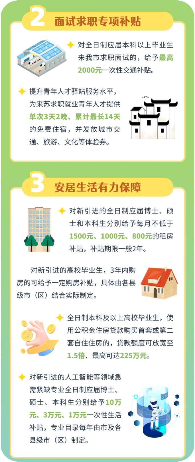 对人工智能企业新引进的全日制博士、重点高校全日制硕士及本科生分别给予不低于15万元、10万元、5万元购房补贴或3年每月不低于1500元、1000元、800元的租房补贴。