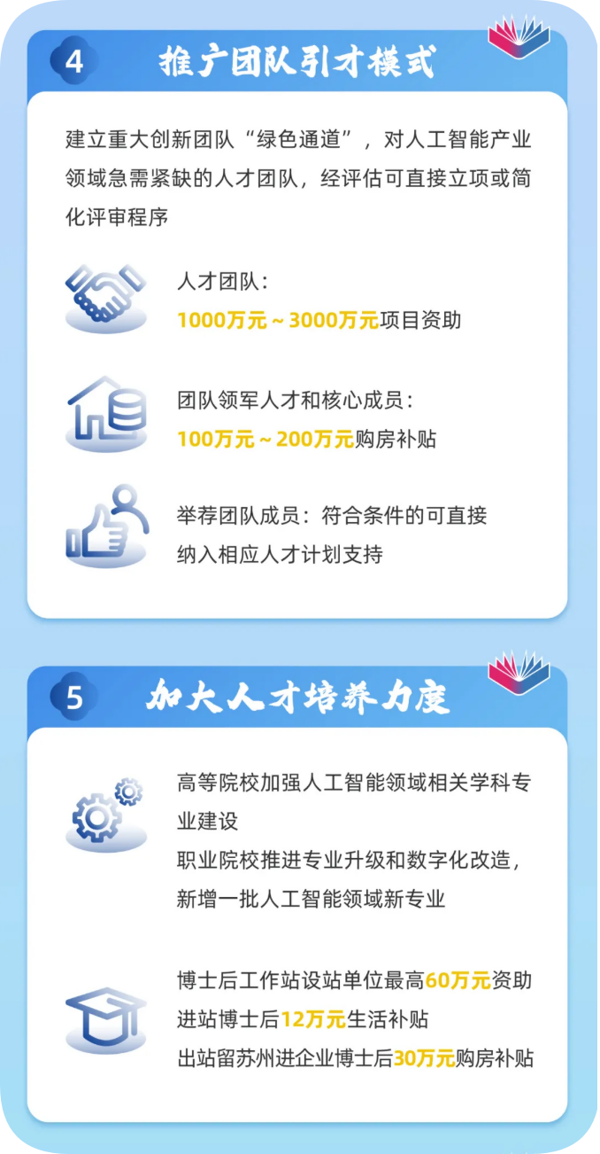 在苏州市重点产业紧缺人才计划中,每年专设300个左右“人工智能专项”名额,经认定后,给予最高30万元薪酬补贴。