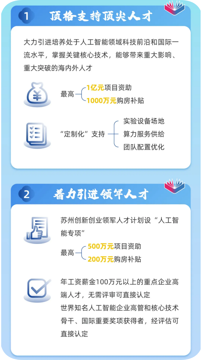 在苏州创新创业领军人才计划中,每年专设100个左右“人工智能专项”名额,特别优秀的可突破学历、来苏州时间等限制,给予100万元~500万元项目资助和100万元~200万元购房补贴。世界知名人工智能企业高管和核心技术骨干、国际重要奖项获得者,经评估可直接认定。