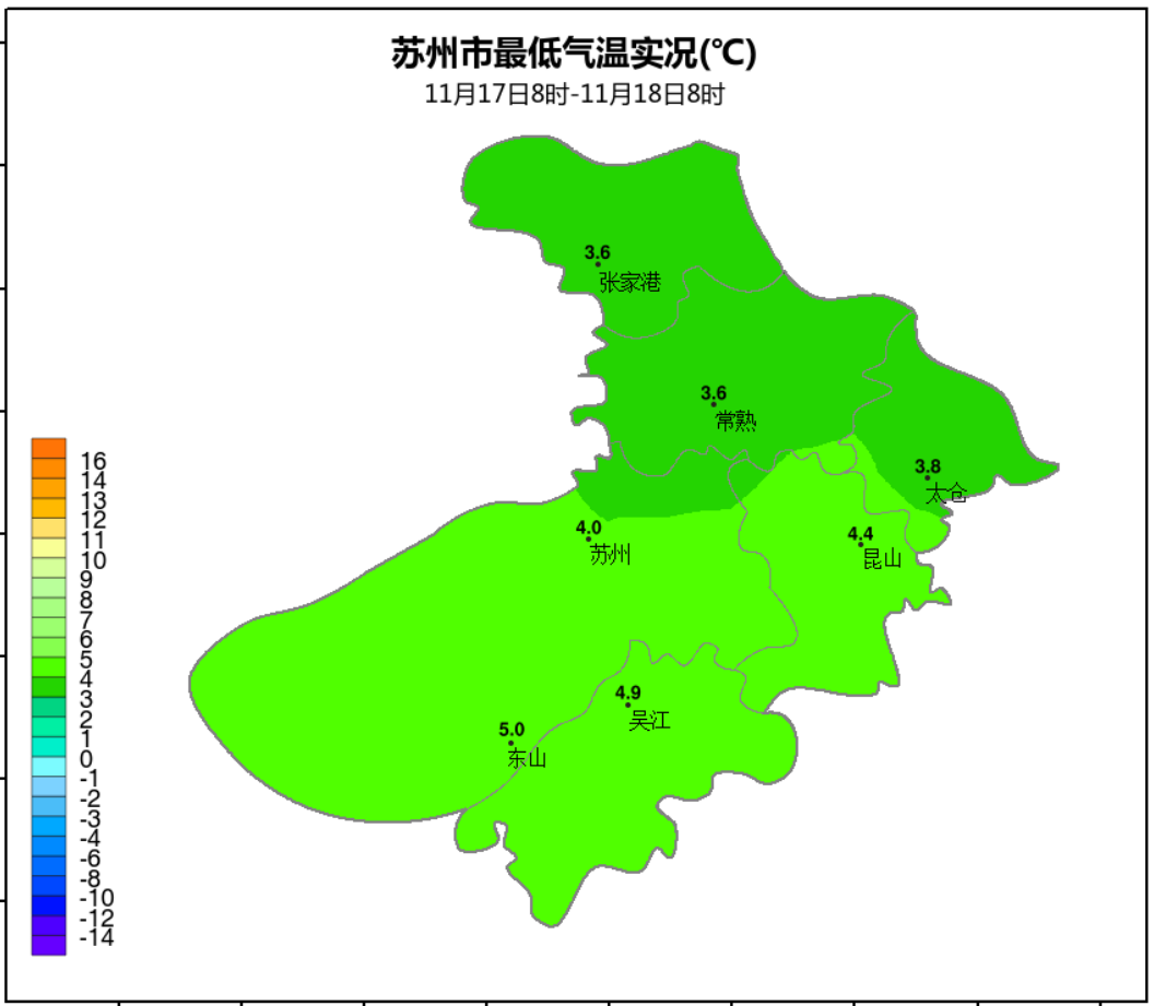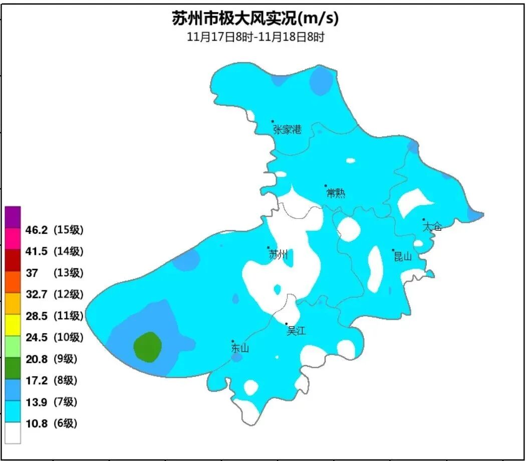 下半年首个寒潮来袭,受其影响,昨天(11月17日)起苏城出现了陆上阵风6~7级、水面8级的偏北大风,48小时最低气温降幅6~8℃,过程极端最低气温3.6℃。