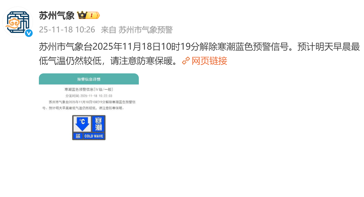苏州市气象台也在10时19分解除了寒潮蓝色预警信号。不过明天早晨气温仍然较低,早上出门记得多穿点儿。