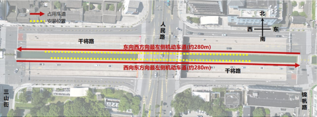 交通组织:占用干将路(三山街-锦帆路)下穿隧道双向最左侧机动车道(约280m),过往机动车可从其它车道通行,非施工时间段恢复路面正常通行。