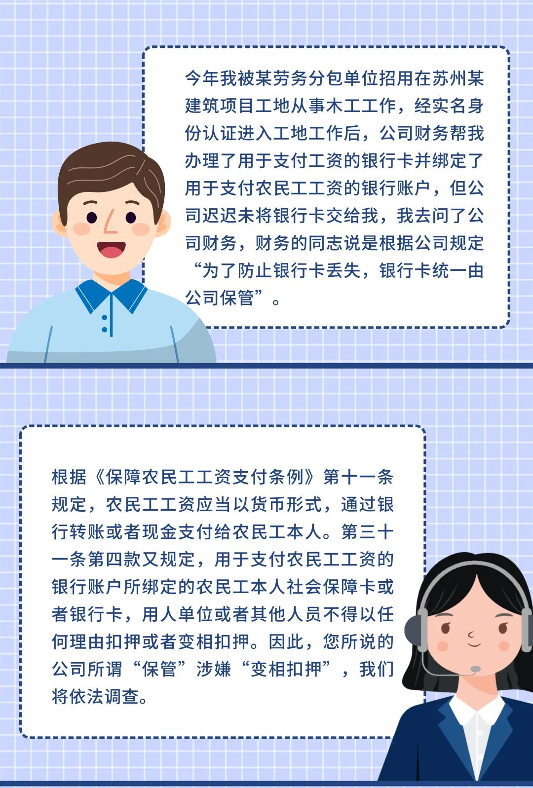 2、建筑市场上此前就盛行收缴农民工银行卡的情况,《保障农民工工资支付条例》明确禁止用人单位或其他人员以任何理由扣押或变相扣押用于支付农民工工资的银行账户所绑定的农民工社保卡或银行卡,一旦施工总承包单位违反规定,同样构成拖欠工资,情节严重的,还可能触发拒不支付劳动报酬罪的刑事处罚。